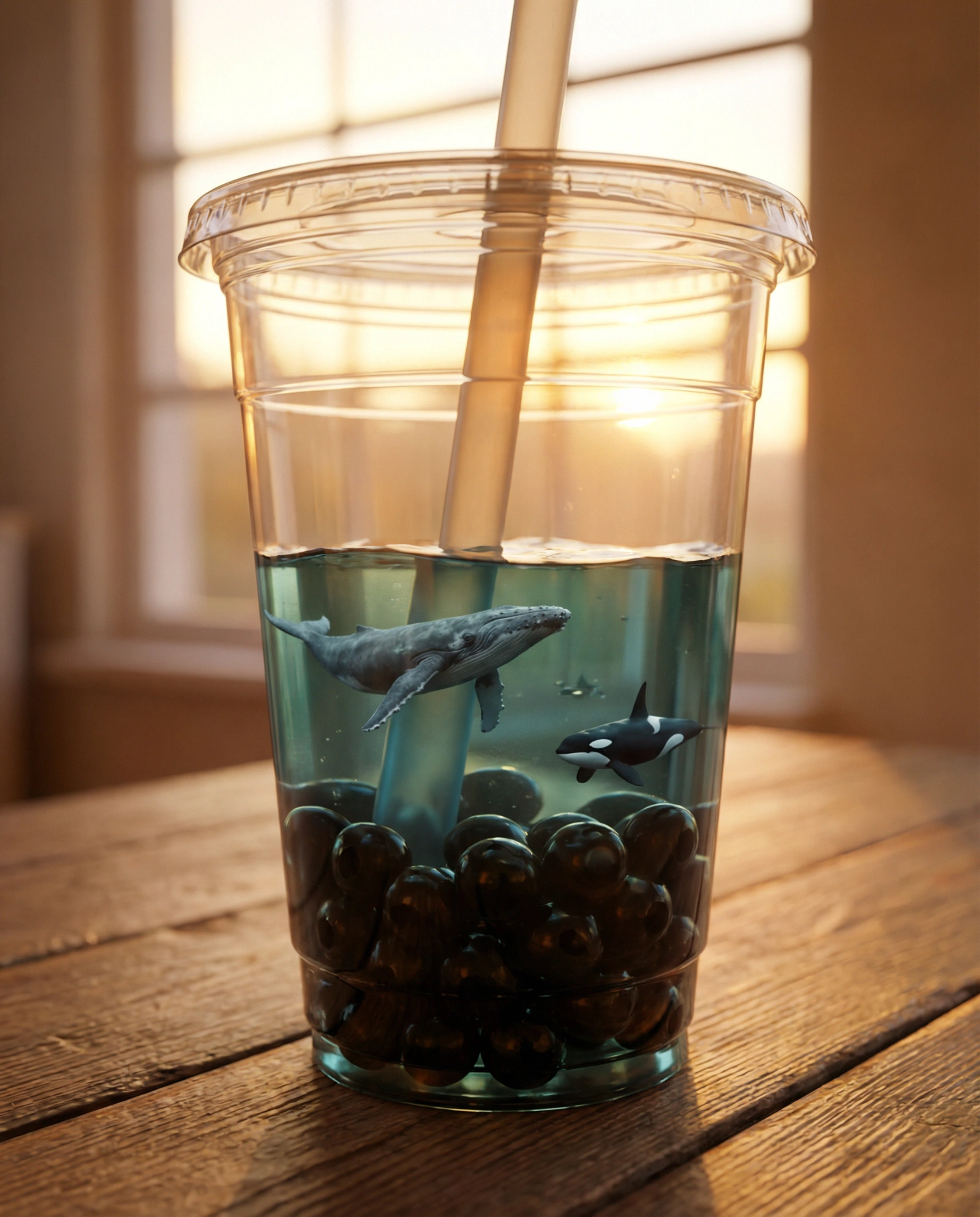 A close-up of a boba tea cup. The "tea" is actually a miniature ocean with tiny whales swimming among the black tapioca pearls. The pearls are glossy and reflective. Amber lighting.