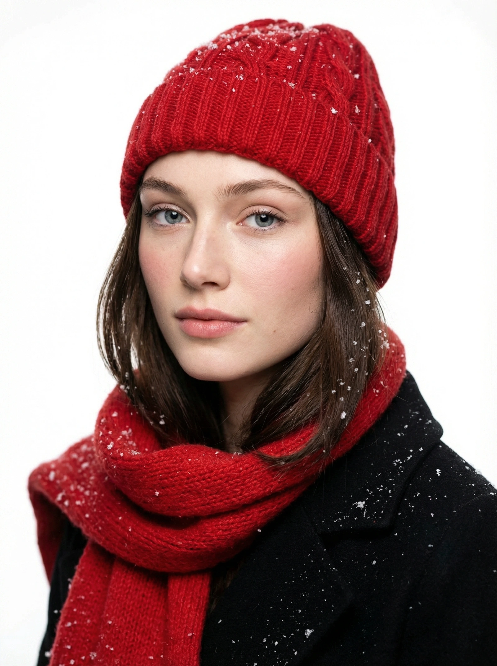 Professional studio portrait photography, Christmas winter theme, white studio background. Young woman, age 20-23, beautiful delicate features: - Large expressive eyes with double eyelids - Elegant facial features, high cheekbones - Natural makeup: soft pink blush, natural lip color - Shoulder-length dark brown hair - Fair porcelain skin with realistic texture (visible pores) Outfit: - Bright red cable knit beanie - Bright red chunky wool scarf - Black wool coat Studio setup: Pure white seamless background, professional soft lighting, snowflakes falling on hair/beanie/scarf Technical: 85mm lens, f/1.8-2.8, natural soft studio lighting, realistic skin texture, high-end fashion portrait quality Mood: Natural, warm, gentle expression, serene and contemplative