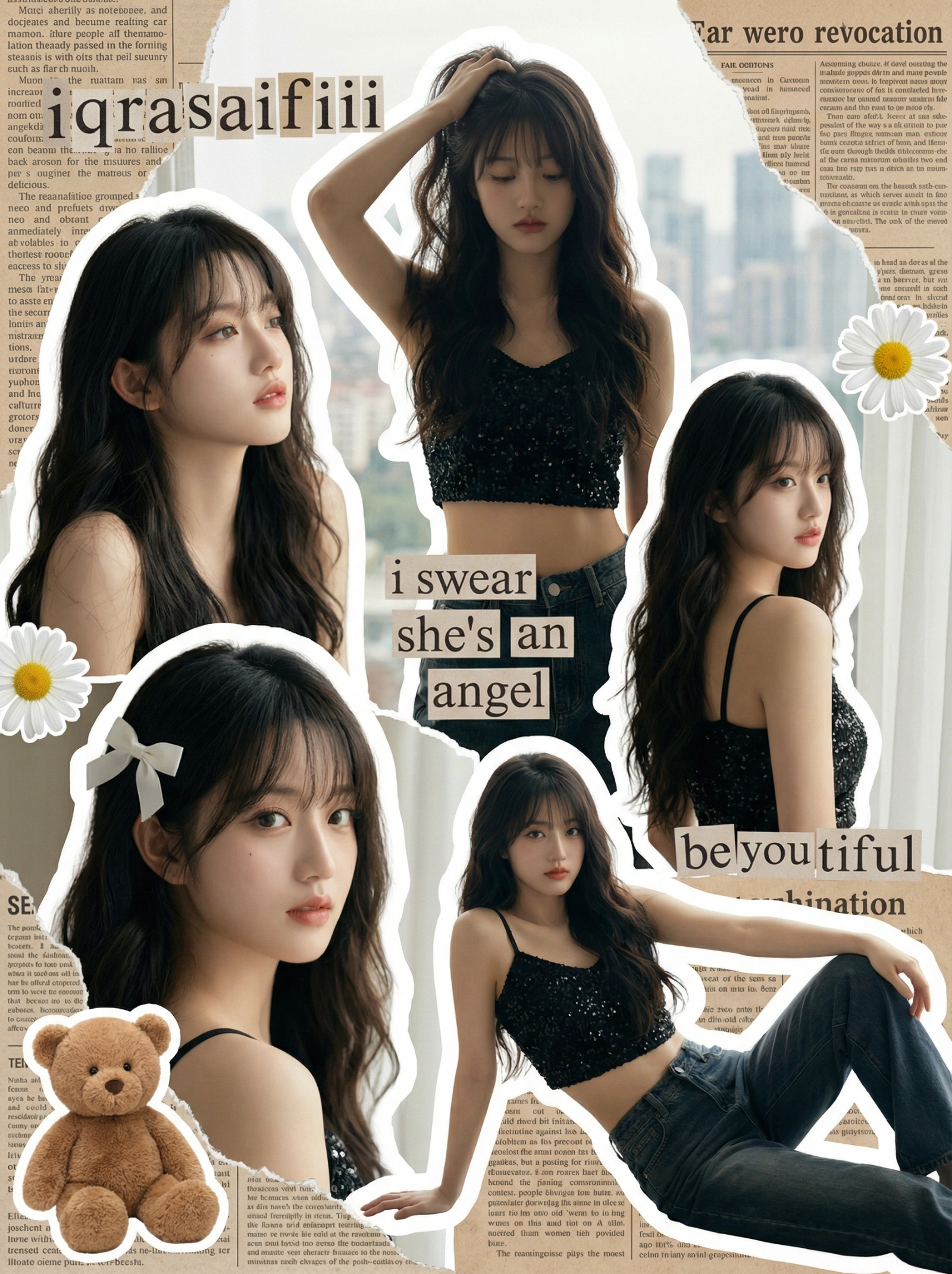 { "art_style_description": { "type": "Digital Scrapbook / Fan-Edit Collage.", "aesthetic": "Y2K, Coquette, K-pop Idol Fan Art.", "visual_structure": "Multiple photographic cutouts of the same subject arranged in a chaotic but cohesive layout on top of a vintage textured background. Each cutout has a thick white stroke/outline to resemble a sticker." }, "subject_details": { "demographics": "Young Asian woman (K-pop idol aesthetic), fair skin, delicate features.", "hair": "Long, voluminous, dark wavy hair with air bangs. In one panel, she wears a small white ribbon clip.", "outfit": "Black sequined/embellished crop top (bralette style), dark denim jeans.", "makeup": "Peach-toned blush, glossy lips, soft eyeliner." }, "pose_breakdown_panels": { "panel_1_top_center": "Portrait shot. Subject looking straight ahead/slightly down with hand in hair, elbows raised. Background shows a blurred cityscape.", "panel_2_bottom_right": "Seated/Reclining pose. Subject leaning back, one arm supporting weight, looking coolly at the camera. Wearing jeans.", "panel_3_middle_right": "Over-the-shoulder shot. Subject looking back at the camera with a soft gaze, arm raised touching head.", "panel_4_bottom_left": "Close-up portrait. Subject looking to the side, wearing a white bow hair clip.", "panel_5_top_left": "Bust-up shot. Subject gazing off-camera with a dreamy expression." }, "graphic_elements_and_overlays": { "background_texture": "Vintage newspaper print text (sepia/beige toned).", "stickers": { "text": "Ransom-note style text blocks reading 'iqrasaifiii', 'i swear she's an angel', and 'beyoutiful'.", "objects": "A brown plush teddy bear sticker in the bottom left corner.", "decor": "White daisy flower graphics, jagged torn paper edges." } }, "camera_technical_values": { "source_photo_style": "High-end fashion editorial photography.", "lens": "85mm (Portrait telephoto).", "lighting": "Natural Window Light (Soft, directional sunlight coming from the side).", "color_grading": "Slightly desaturated source photos contrasted against the warm beige newspaper background.", "resolution": "High fidelity cutouts." }, "composition": "Overlapping layers. The center and right photos are larger, while smaller details fill the corners." }
